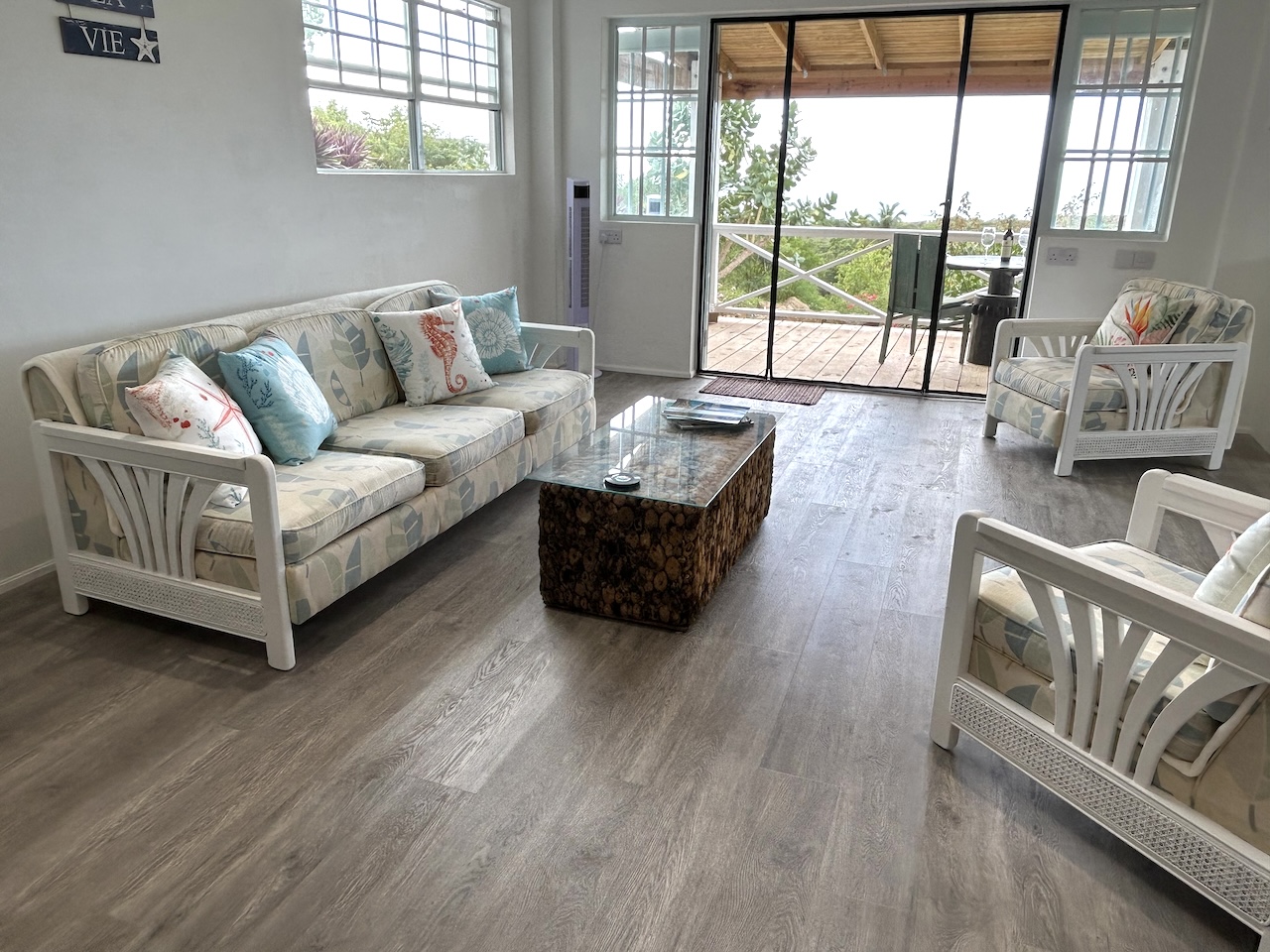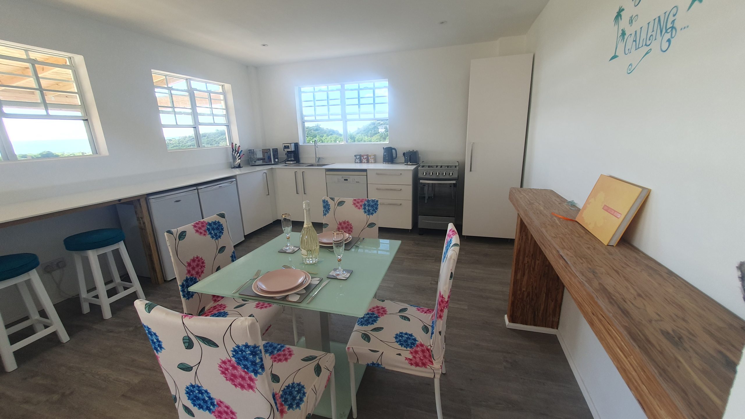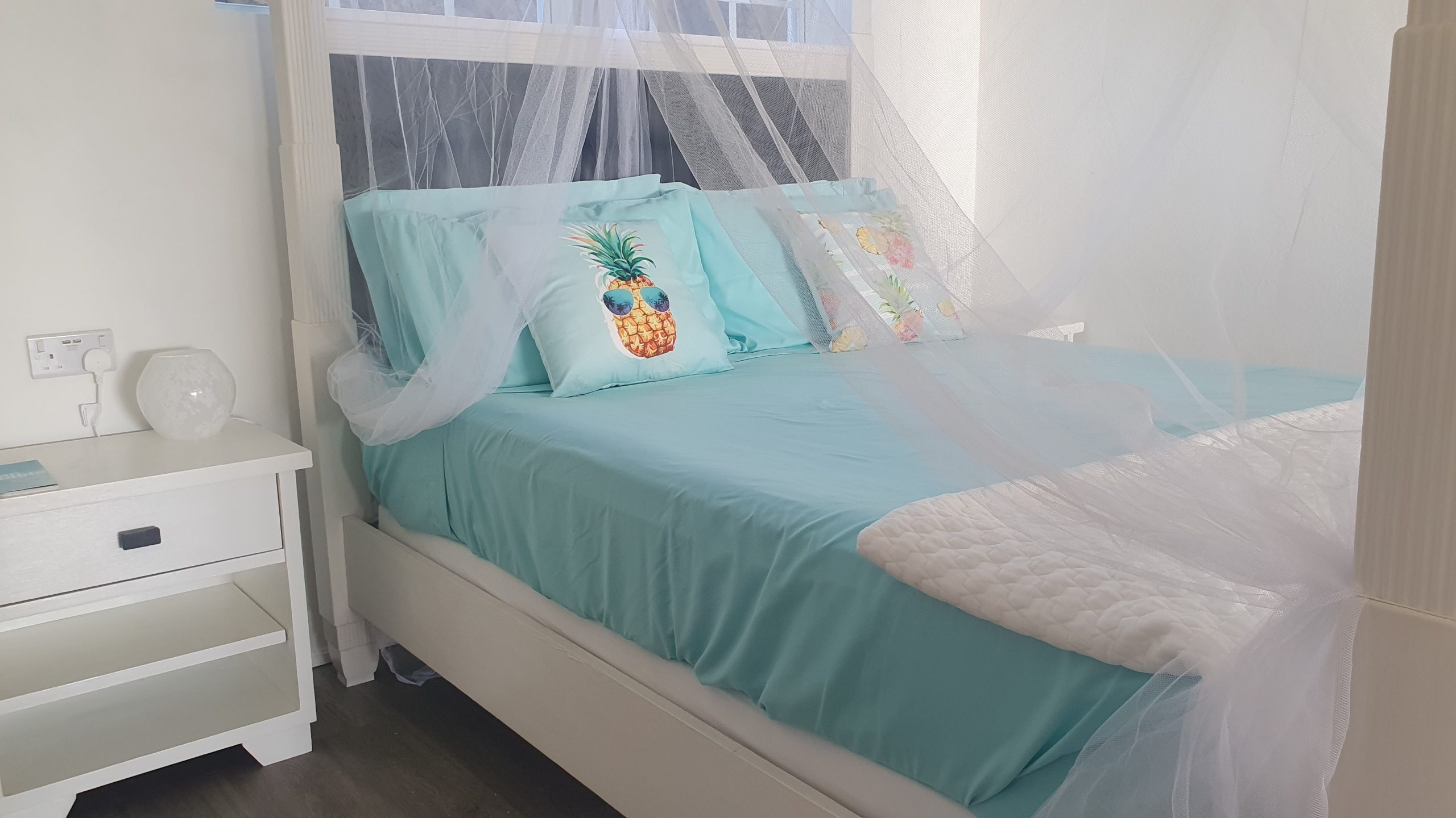 The interior of this spacious accommodation (660sqft) is whitewashed with splashes of turquoise, reflecting the hues of the Caribbean Sea.